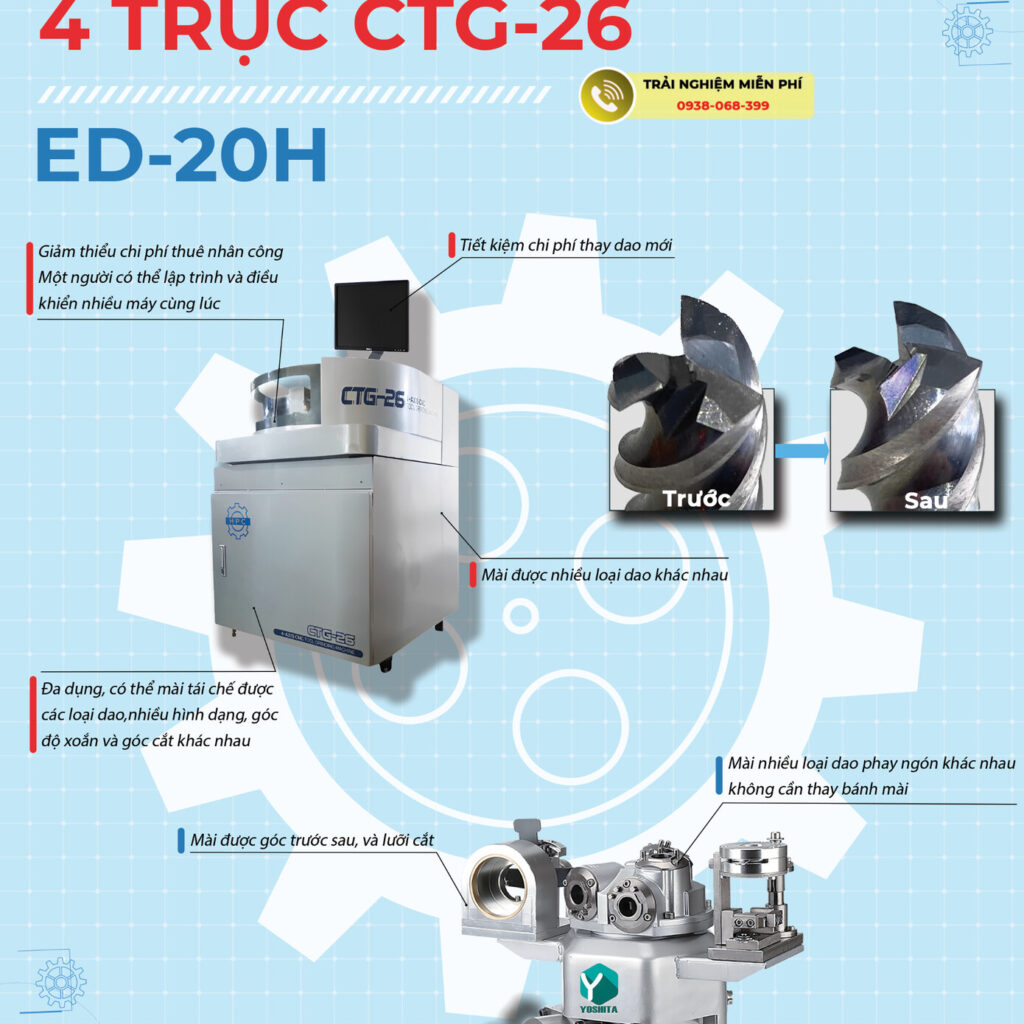 Vậy, chúng ta hãy cùng tìm hiểu về 2 dòng máy mài dao, mũi khoan tự động 4 trục CTG-26 và ED-20H, những khả năng mà 2 dòng máy này mang lại cho doanh nghiệp, ưu điểm, ứng dụng của chúng như thế nào nhé.