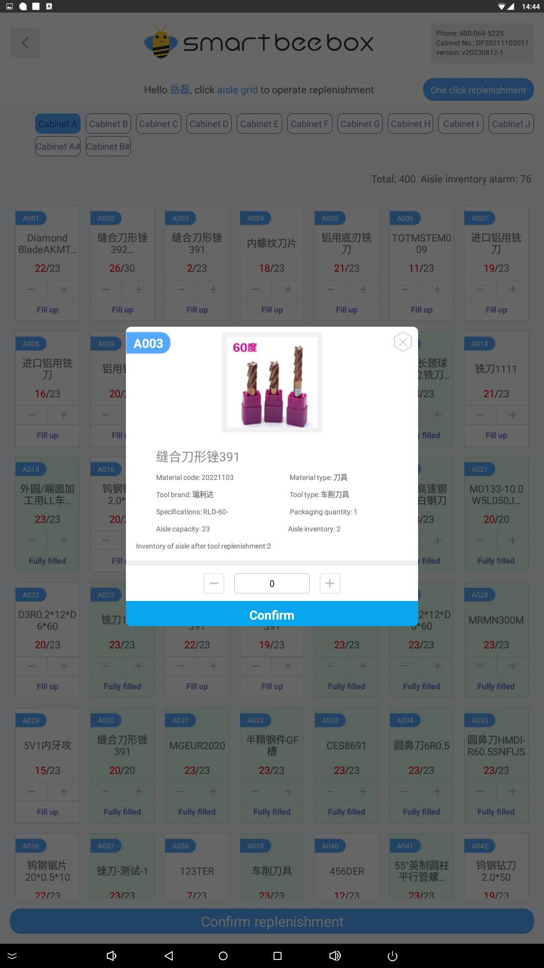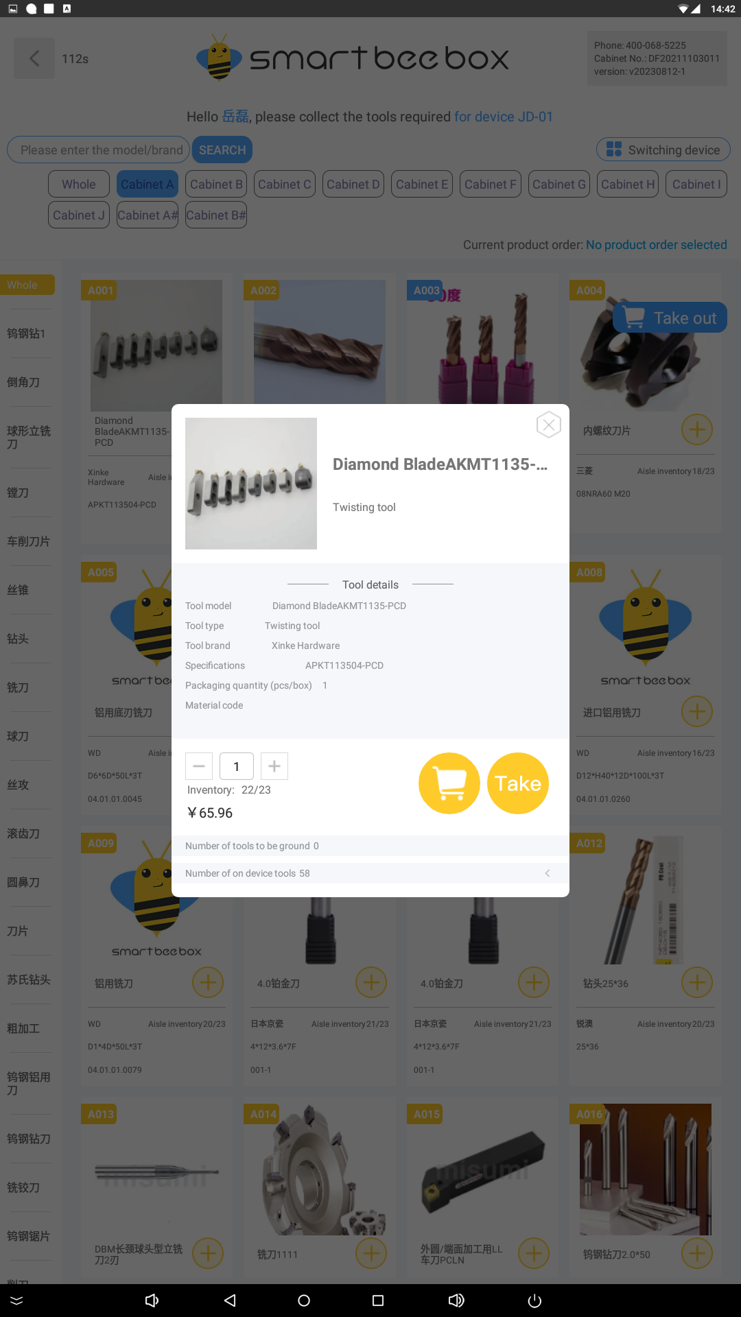 Sau khi xác định được loại dao cụ cần lấy, số lượng cho vào giỏ hàng và bấm chọn “Borrow”, “Confirm” là hệ thống lò xo và thang nâng sẽ tự động lấy chính xác loại dụng cụ và số lượng chúng ta cần.