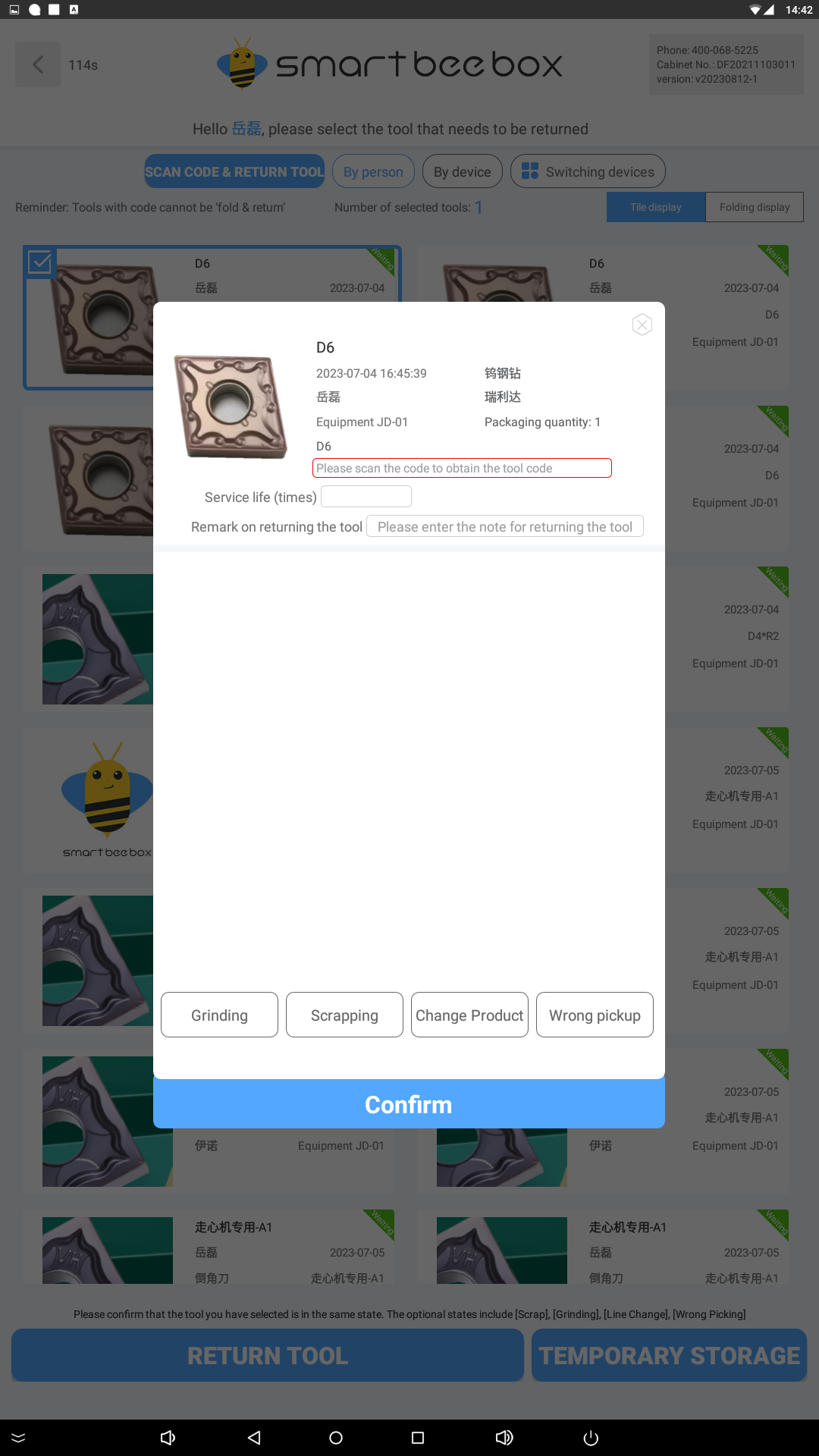 Quản trị viên có thể đến chỗ trả dụng cụ và kiểm tra tình trạng thực tế với tính năng thu hồi “Tool Retrieval”. Tính năng này giúp kiểm tra người mượn và trả dao cụ có đúng với những gì đã khai báo trên hệ thống hay không. Từ đó việc kiểm soát tồn kho, thất lạc, tuổi thọ chặt chẽ hơn, tiết kiệm chi phí cho doanh nghiệp.