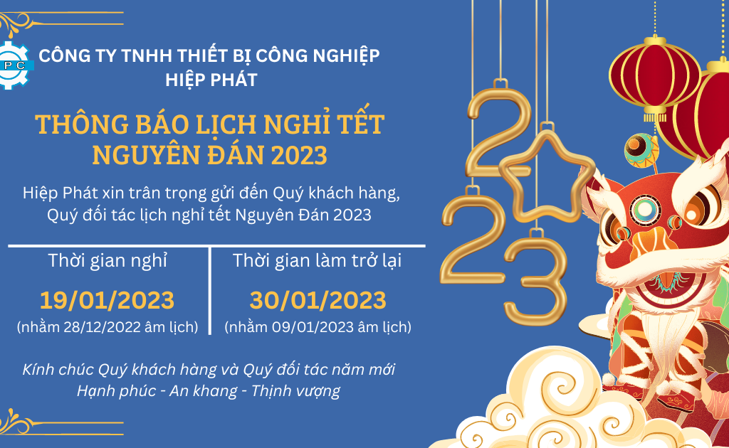 Công ty TNHH Thiết bị Công nghiệp Hiệp Phát xin chân thành cảm ơn sự đóng góp và ùng hộ của Quý khách hàng, Quý đối tác trong suốt thời gian qua. Hiệp Phát xin trân trọng gửi lịch nghỉ tết Nguyên Đán 2023 như sau: